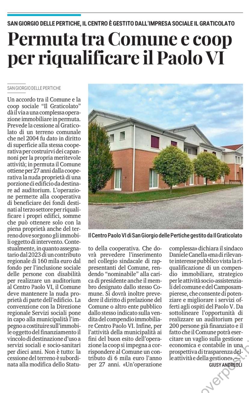 A San Giorgio delle Pertiche, un’importante iniziativa di collaborazione tra il Comune e la cooperativa sociale Il Graticolato sta ridefinendo il concetto di inclusione e riqualificazione del territorio. L’accordo prevede un’operazione immobiliare in permuta che punta a valorizzare il Centro Paolo VI, trasformandolo in un punto di riferimento per il sociale e la comunità.